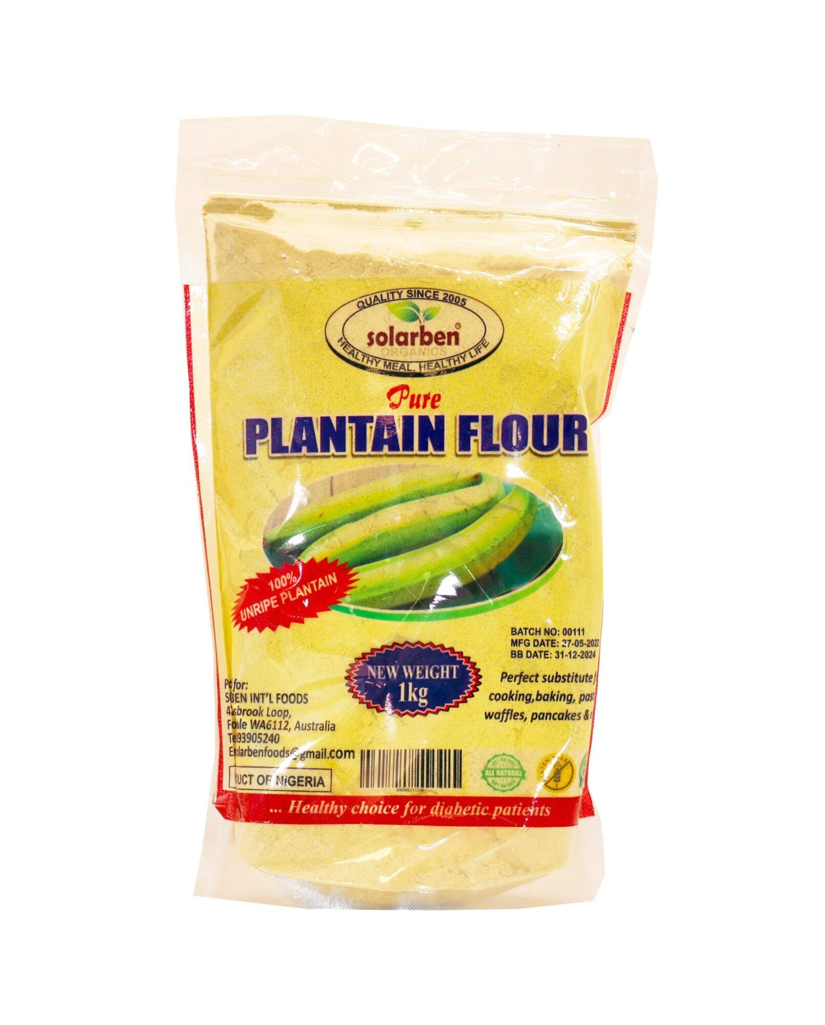Solarben Plantain Flour is made with 100% Green Unripe Plantains, sourced directly from farmers. It is an all-natural, plant-based flour that is free from grain, gluten, bleach, preservatives, and additives.