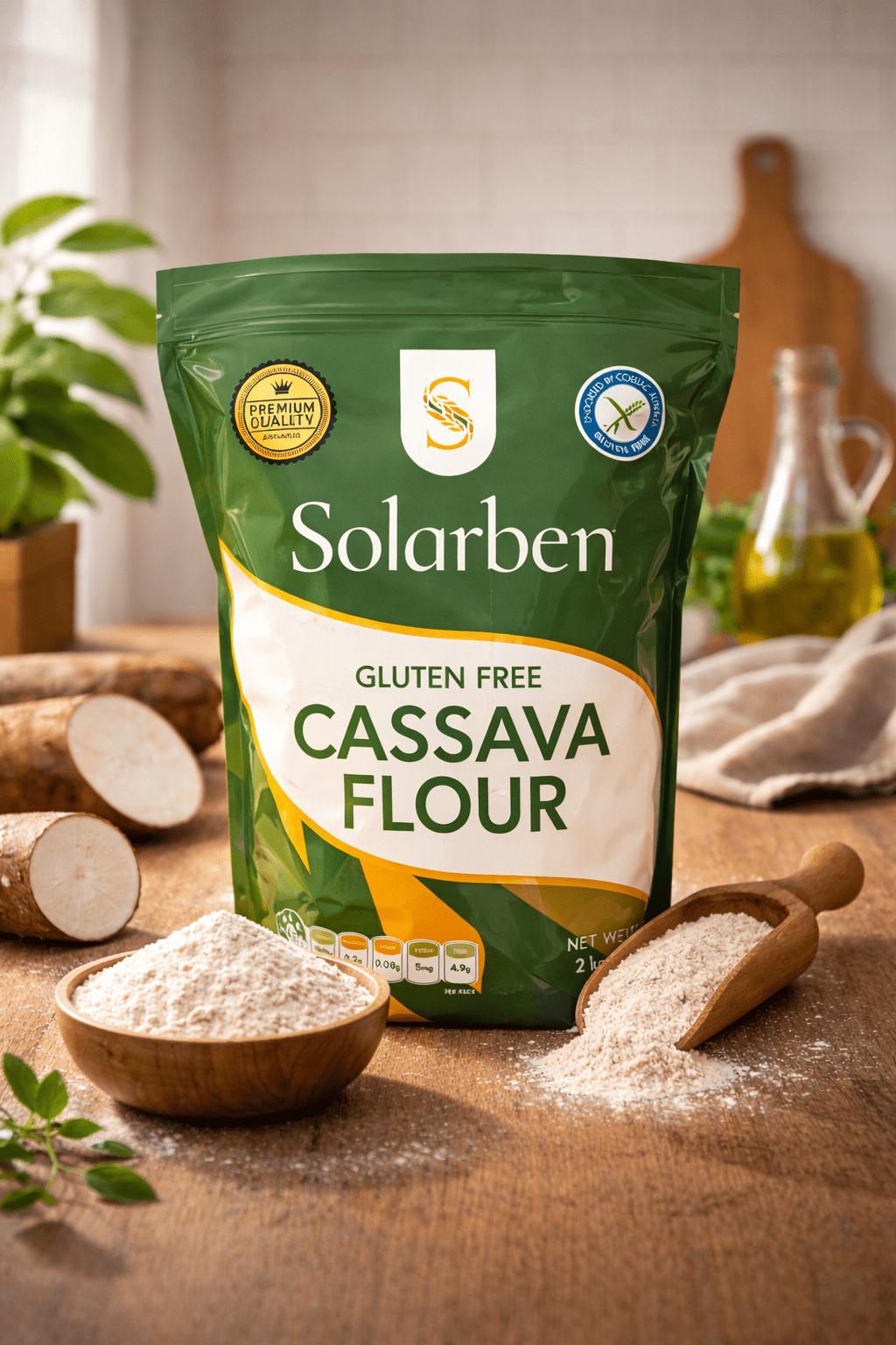 Solarben pure Cassava flour is pretty much the perfect flour for people following a gluten-free or paleo diet. It replaces wheat flour 1 to 1 in most recipes, and has a neutral taste, lots of fibre, and a fine texture that helps dough hold together and prevents grainy, gritty breads and cakes. The cassava flour is created from freshly harvested cassava tubers (roots). The fresh roots are then washed, peeled, grated, blended into a paste-like consistency where it is then filtered, dried and sifted to be the flour you see in this package.